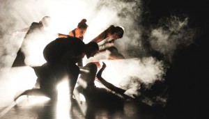 The choreography, some of which was shown recently in process, is a mix of set material and improvisational structures, supported by a musical score of live, distorted vocals amplified through a vintage microphone and by the suspenseful sounds of Bernard Herrmann’s overture for Alfred Hitchcock’s film North by Northwest. In one group section, the ensemble is a mass organism of tangled limbs that builds, unravels and builds again while travelling to different parts of the stage. Never quite separating, the group morphs shape through improvised sequences of interlocking bodies that create dynamic tableaux depicting events from the past, present and future. The work illustrates Out Innerspace’s signature combination of whimsy and skill.