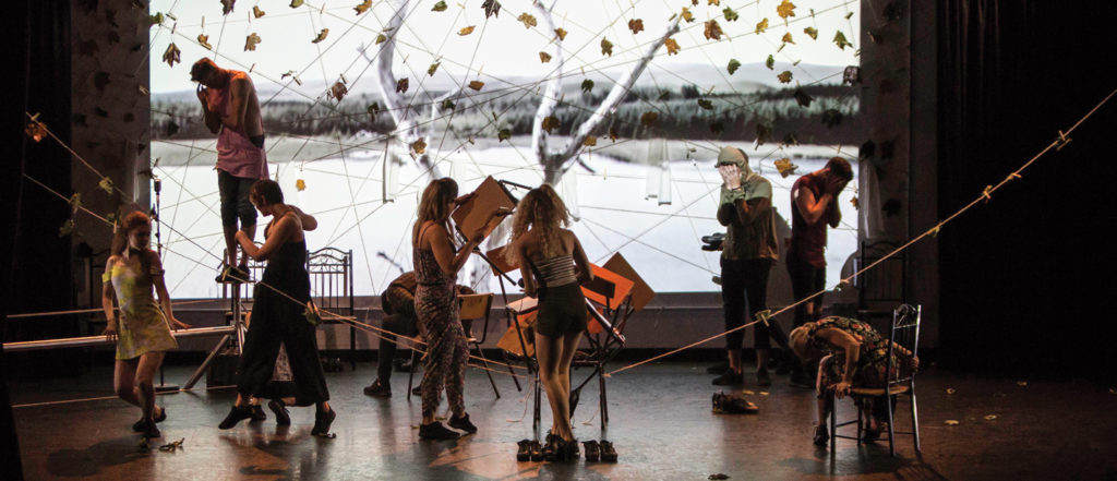 The inventive set, designed by Declan English, begins as a stack of chairs intertwined with cords from which hang autumn leaves. At the beginning, each performer frantically takes and rearranges the leaves while pre-recorded text of their online dating profiles points us toward the idea that this action represents their personal traits being rearranged as they search for love.