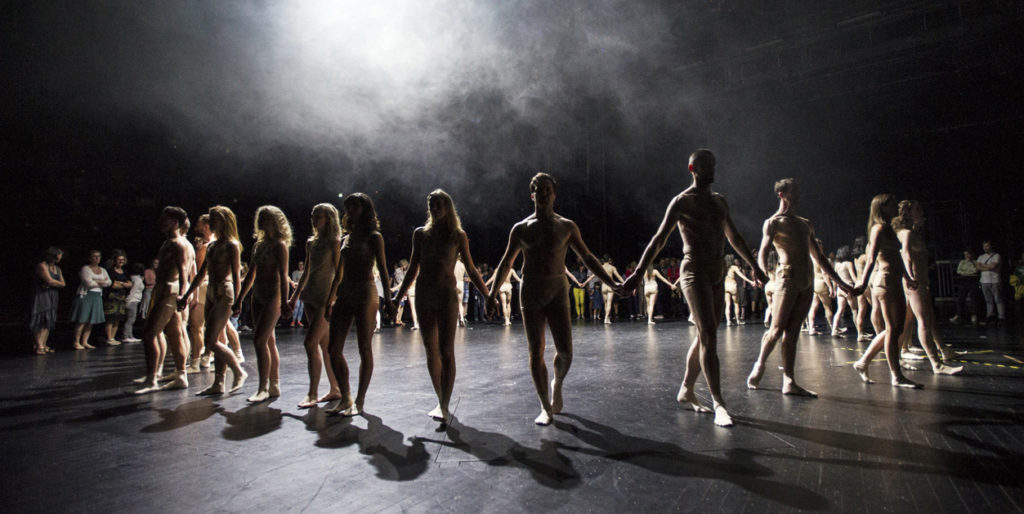 The dancers took off their costumes, leaving their characters behind, and entered the turntable as one great homogeneous group, with the audience standing around them in a big circle. There they made different sculptural formations and engaged in some individual dancing.