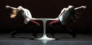 The dancers circled the table in unison folk-dance like patterns, leaned in and away from each other, and sat, stood and slid across the table. The dynamic in Lopez Ochoa’s choreography shifted from four individuals in harmony to those same individuals lunging at each other’s throats. Whether with the dancers lined up directly behind Hovhannisyan, who stared at the table surface as if gazing into a crystal ball while the others leaned off their line to see what he was seeing or, with their knees tucked to their chests, cowered underneath the table, Rondo Ma Non Troppo delivered more than a table dance; it opened a window into humanity.