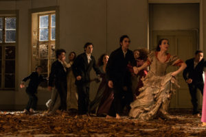 Pathos reigns with the arrival of a long line of dancers entering one by one in a human chain, heads bowed. The women wear long, colourful and elegant dresses, the men are in tuxedos, as in many Bausch creations. Very often, as the ensemble screams, cries, pants, mourns and laughs hysterically, their pain is palpable, their bewilderment piercing. When the men and women dance together, slow and detached, they seem neither interested in nor respectful toward each other.