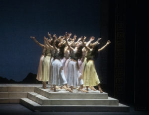The costuming and scenery designed by Jean-Marc Puissant felt aptly Grecian, with simplified garments for the many characters, with 14 individually named ones plus 13 groups of secondary figures. Puissant’s changeable settings effectively establish the action in ancient Greece as well as in Babylon, marked at moments by the presence of a large sculpted head of the goddess Aphrodite.