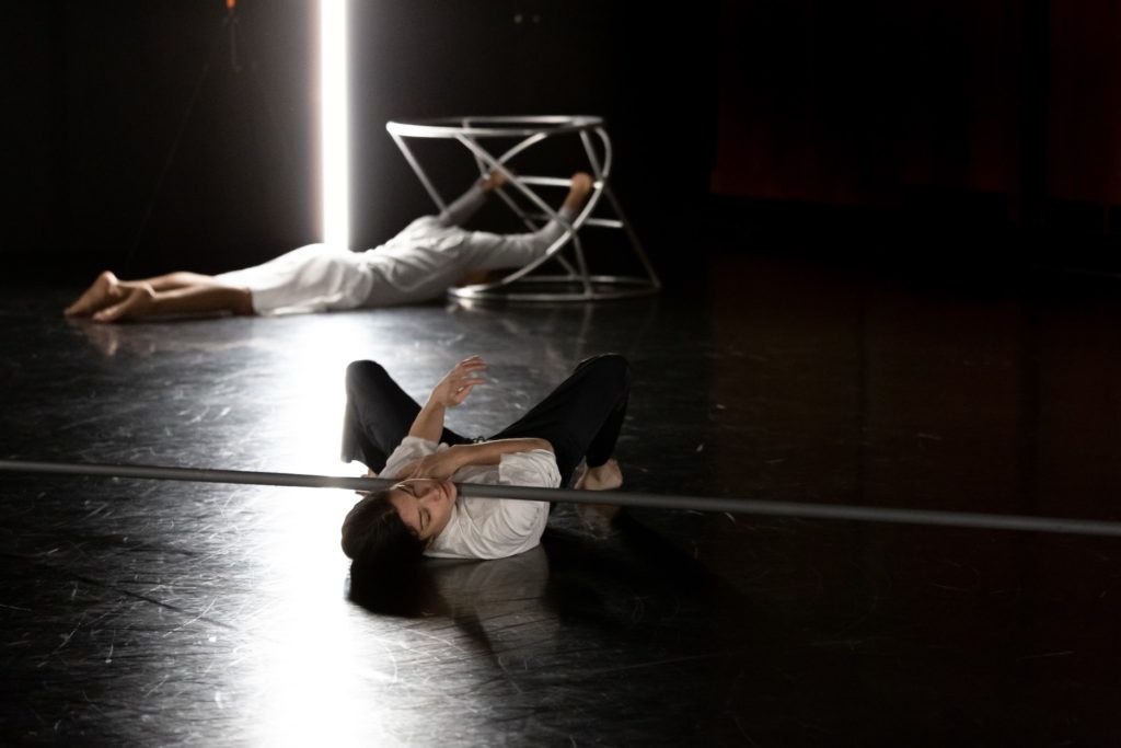 Chapple’s 2017 work Suffix, supported by the Iris Garland Emerging Choreographer Award, incorporated Spence’s large-scale metal sculptures as surreal extensions of the dancers’bodies, creating an eerily futuristic scene. The black-box theatre was transformed into a starkly lit, abstract laboratory reminiscent of a science fiction movie, placing audience members around the perimeter of the stripped-down performance space. Suggesting human attachment to ever-advancing technology, the dancers moved in and out of duets with a large mirrored ball, a long metal rod, a rounded asymmetrical cage and other objects. Georgia Straight reviewer Janet Smith wrote, “With Suffix, Chapple, working with Spence, has asserted herself as a unique and fearless voice on the dance scene — and someone unafraid to go to dark places in daring and visually bold new ways.”