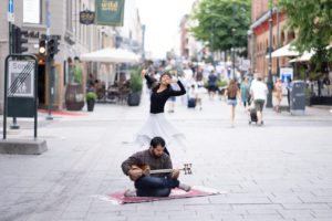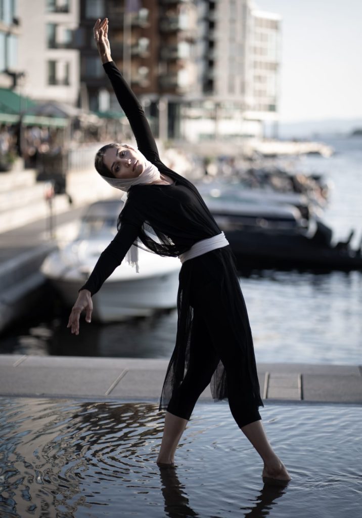 Azma has also been channelling her energies into Recite the City, a collaboration with Iranian Ali Aalaei, who composed the music for tār (a double-bowled Iranian lute), which he played live during performances from July to October 2021. Much movement was improvised, in relationship to audience participation and to each location. Recite the City followed Azma’s quest for personal connection to emblematic Norwegian sites such as Karl Johans Gate (the main street in Oslo), Akershus Fortress and Aker Brygge Marina.
