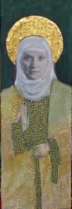 Barbara Bourget as a benevolent saint by Barb Clausen, 2019, 4″ x 12″, mixed media on panel | Photo courtesy of the artist