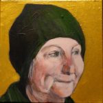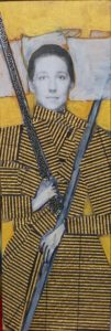 Karen Jamieson as Joan of Arc by Barb Clausen, 2019, 4″ x 12″, mixed media on panel | Photo courtesy of the artist