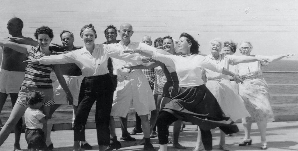 Magda Hanova (in front, in dark skirt and white top) leading fellow passengers in dance class on board ship to Canada, 1957 | Photo courtesy of Karen Kurnaedy