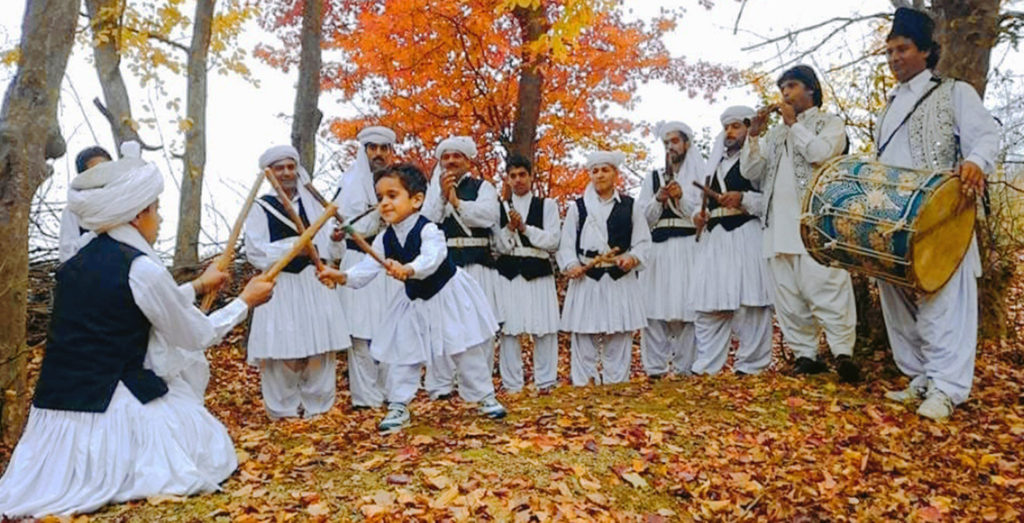 While Chiksay’s troupe of 30 dress in traditional black pants, shāl (waist wrap), neckerchief, peytabe (shin wraps), and charoq (leather Kurmanji style shoes), they also innovate. The troupe’s shirts are embroidered with traditional techniques, but new designs transmit their nomadic history and the important role of strong women in their lives. Their symbolic representation of Kurmanji women, who are not permitted to perform with them publicly, is also innovative. In performances, half the troupe wears the customary white colour for women, instead of all of them wearing men’s traditional red.