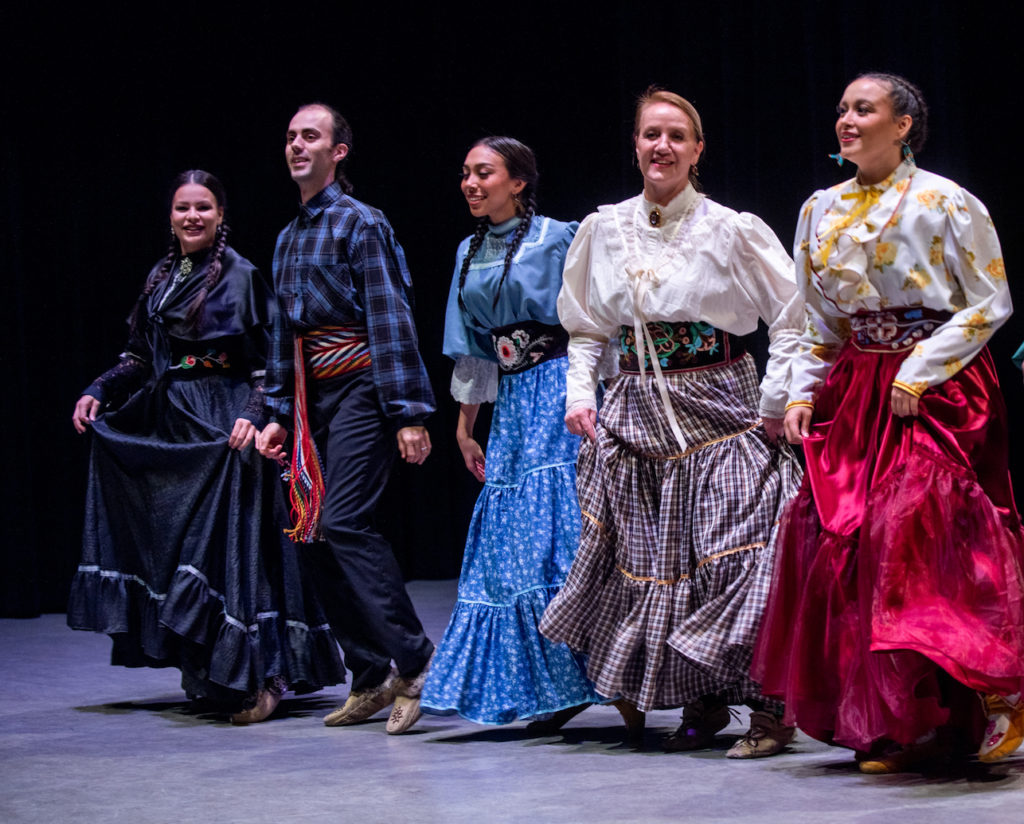 V’ni Dansi — which means “come and dance” in Mitchif, a language of mixed French and Nêhiyawak (Cree) origins — performs both contemporary and traditional dances, aiming to honour the traditional aspects of Métis culture as well as to embrace innovations. Traditional Métis jigs, like the Red River Jig and La Danse du Canard, are a mix of European and Indigenous influences. They have poised upper bodies and feet lifting no higher than the ankle bone. V’ni Dansi performs these jigs, as well as more modern Métis square dances and reels.