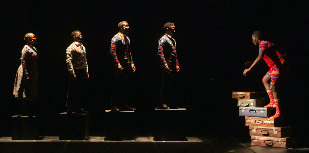 Lubabalo Velebhayi, Tshegofatso Khunwane, Xolisile Bongwana and Zandile Hlatshwayo with choir in Gregory Maqoma and Thuthuka Sibisi’s Broken Chord | Photo: Lolo Vasco