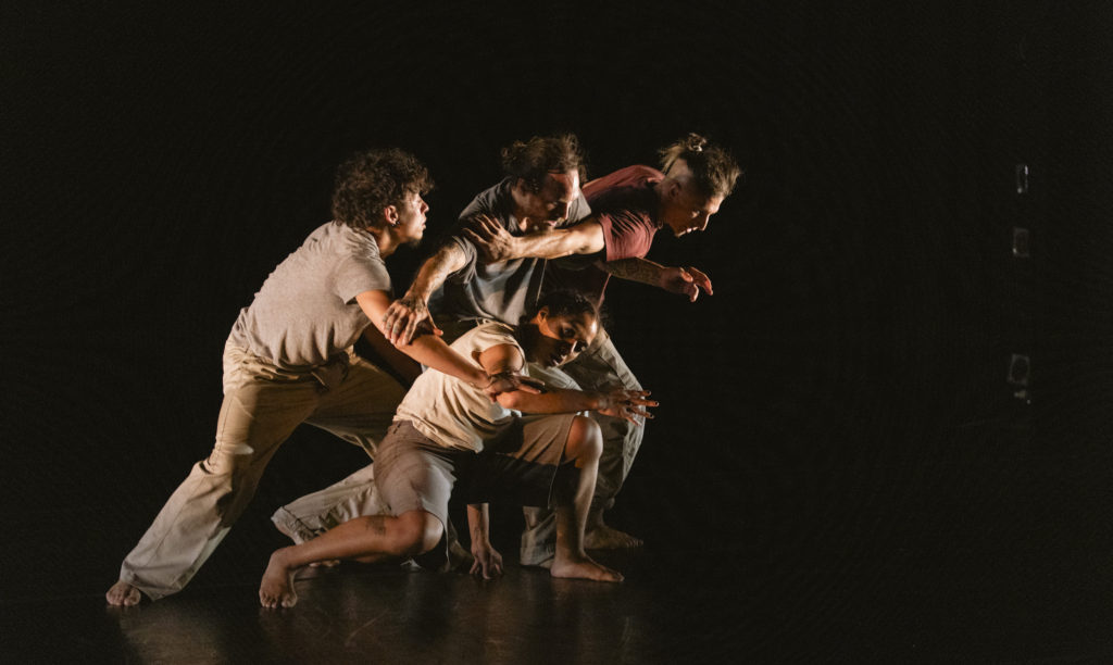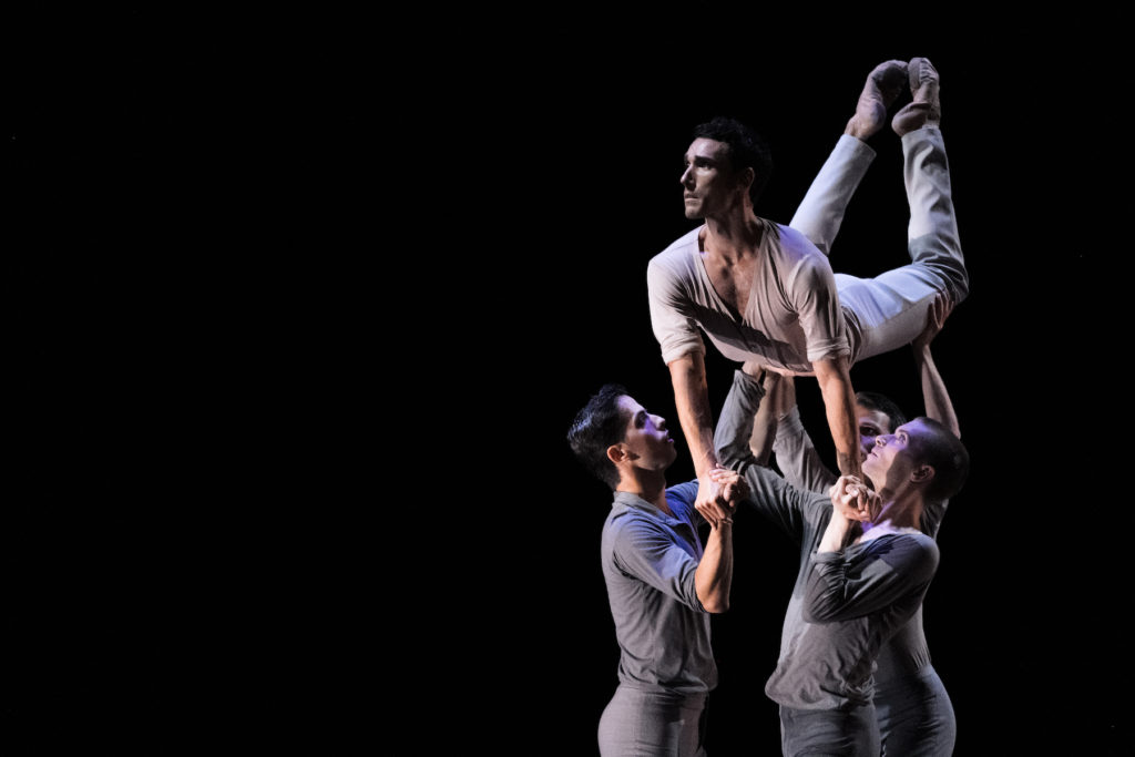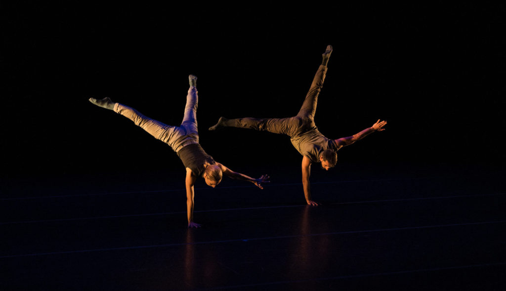 The bill’s opening piece was by Montrealer Pauline Gervais for Pauline Berndsen Danse, a contemporary group she founded in 2018. In MMXX, five dancers in black bodysuits initially moved stiffly like robots to pop music choruses, never touching. Eventually movements softened, physical contact was initiated, and relationships developed as Enrico Caruso sang an aria of romantic hope, Una furtiva lagrima. Then, rather pessimistically, everyone reverted to their primal robotic state. Why everyone moved from isolation to connectedness and back again was a key unanswered question.